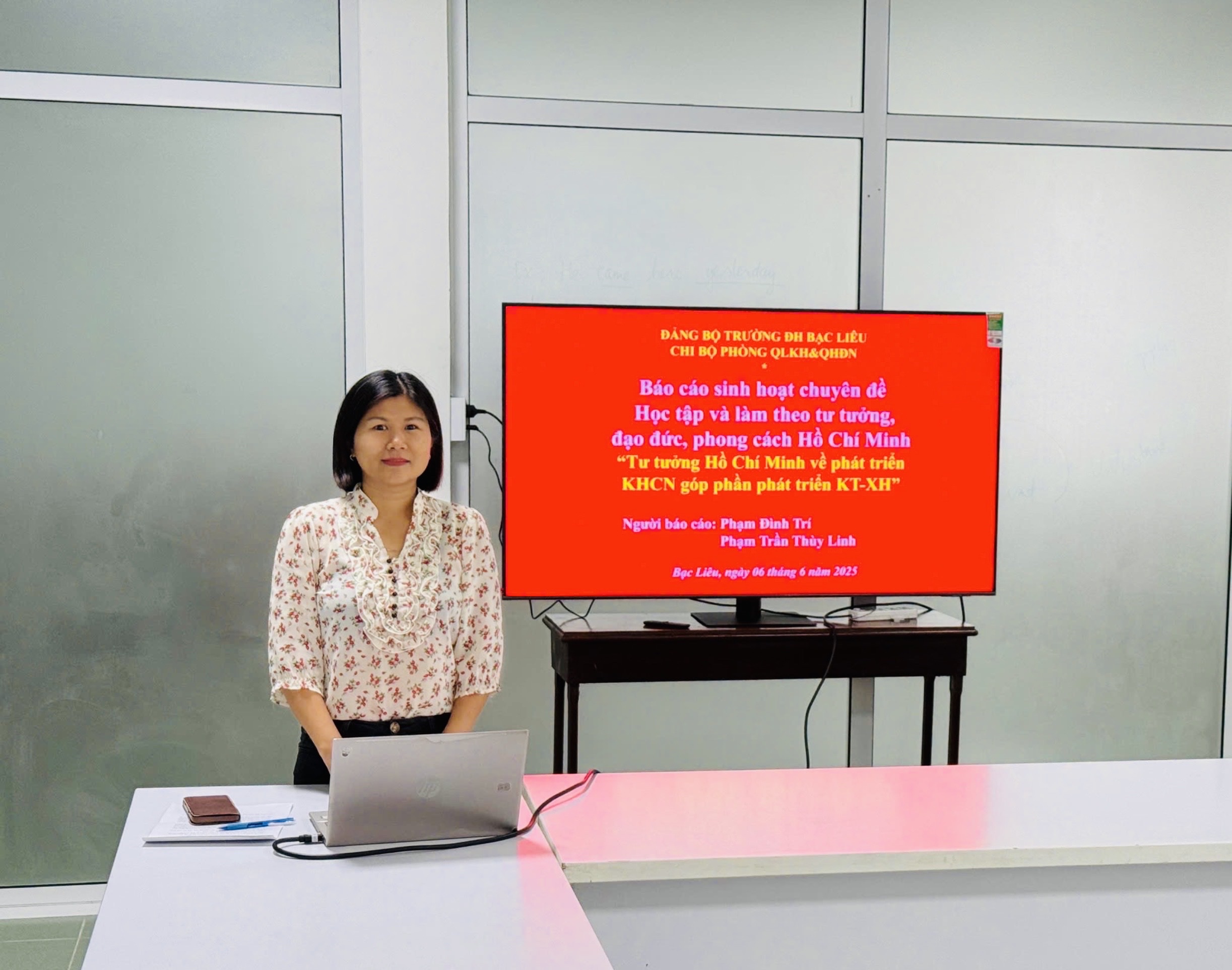 Thực hiện Kế hoạch số 01/KH-CB ngày 28/3/2025 của Chi bộ Phòng Quản lý khoa học và Quan hệ đối ngoại về việc Thực hiện sinh hoạt chuyên đề năm 2025 về đẩy mạnh học tập và làm theo tư tưởng, đạo đức, phong cách Hồ Chí Minh; Vào lúc 8g00 ngày 06/6/2025, Chi bộ Phòng QLKH&QHĐN đã họp định kỳ tháng 6 và tiến hành tổ chức sinh hoạt chuyên đề quý II năm 2025 với chủ đề “Tư tưởng Hồ Chí Minh về phát triển Khoa học công nghệ góp phần phát triển kinh tế-xã hội” tại phòng họp số 1, lấu 3 Nhà Điều hành, trường ĐH Bạc Liêu. Buổi sinh hoạt có sự hiện diện của đồng chí Nguyễn Thị Kiều – Bí thư và đầy đủ các đồng chí trong Chi bộ.