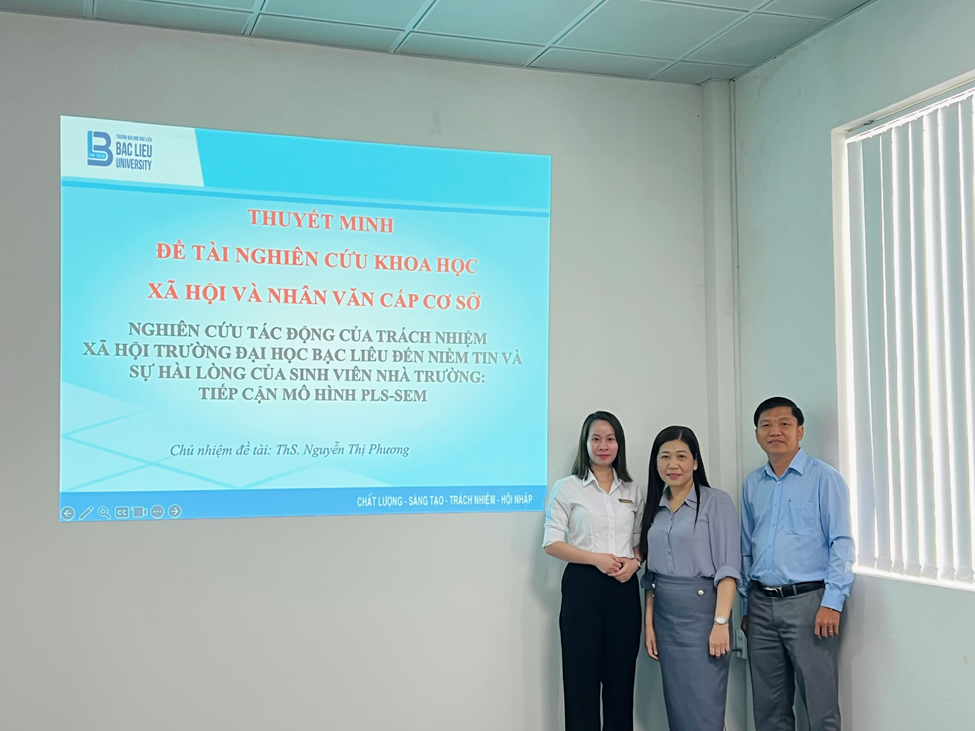 Đề tài “Nghiên cứu tác động của trách nhiệm xã hội Trường Đại học Bạc Liêu đến niềm tin và sự hài lòng của sinh viên nhà trường: tiếp cận mô hình PLS-SEM.” do ThS. Nguyễn Thị Phương – Khoa KT&L (chủ nhiệm), ThS. Nguyễn Thị Bích Ngân (thư ký), CN. Quách Ngọc Phương - Phòng KH&TC, ThS. Nguyễn Minh Thương - Trường Chính trị tỉnh Cà Mau (thành viên) thực hiện.